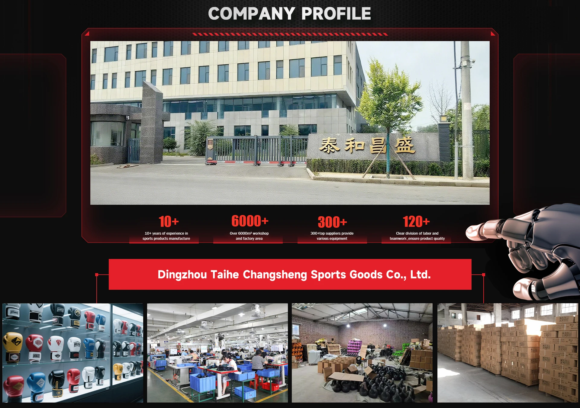 Dingzhou Taihe Changsheng Sporting Goods Co., Ltd. was established on May 4, 2016, is a sporting goods manufacturing company. Our company is located in Dingzhou City, Hebei Province, only 260 kilometers away from Tianjin Port and 250 kilometers away from the capital Beijing. Our company is mainly engaged in sports equipment manufacturing, sports protective equipment manufacturing, taekwondo clothing, protective equipment manufacturing, physical training equipment, outdoor equipment products manufacturing and wholesale company. The company in line with the integrity, contract, keep promise of the enterprise purpose, in 2021 was awarded 3A letter enterprise,we uphold the purpose of long-term happy cooperation with you, Dingzhou Taihe Changsheng Sports will be committed to becoming your preferred supplier and make unremitting efforts, and we will be happy to provide you with: professional, high quality, low price,fast and thoughtful service. Dingzhou Taihe Changsheng Sports will work with you to develop together, improve together, and create a win-win future.